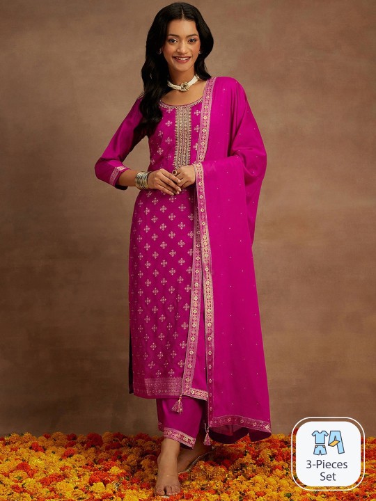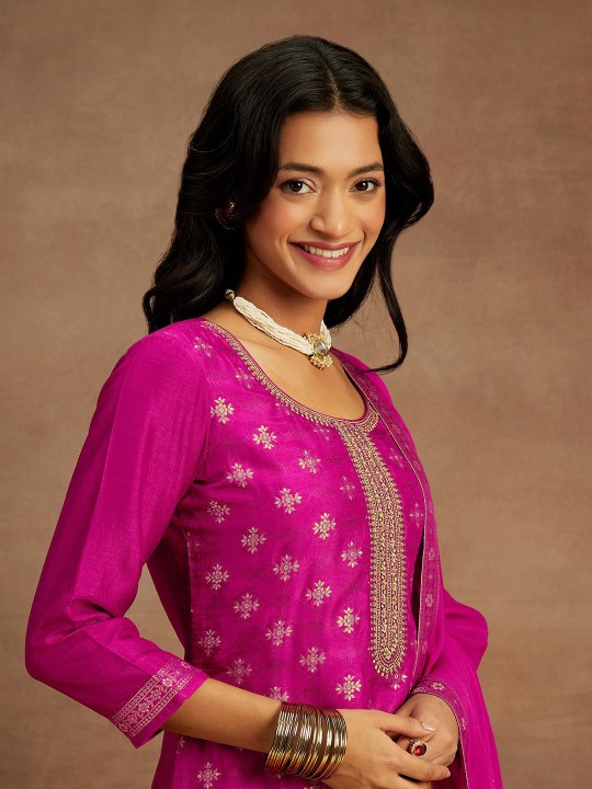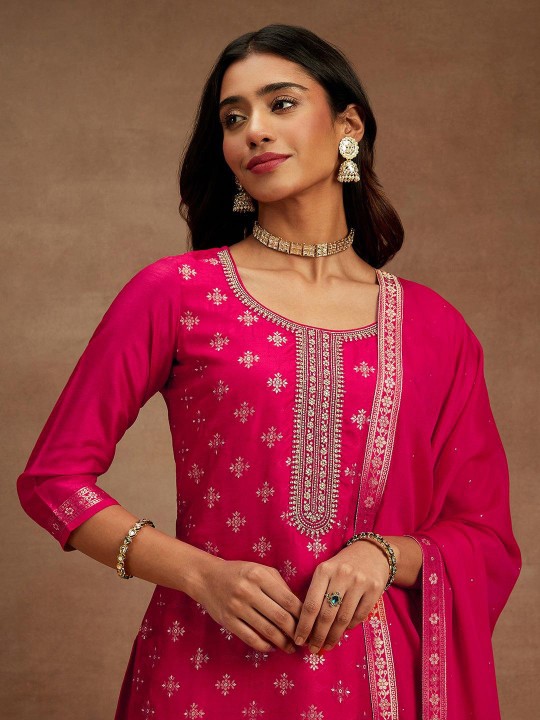 Floral Woven Design Beads & Stones Kurta with Trousers & Dupatta